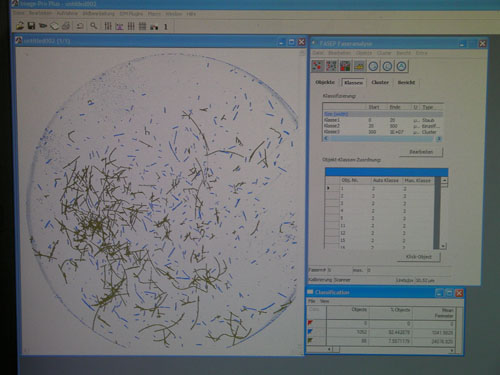 Erkennen der kreuzliegenden Fasern (Cluster) in einer Aufnahme mit dem FASEP Eco SystemBlau überlagerte Objekte sind einzeln liegende Fasern, grüngrau überlagerte Objekte sind sog. Cluster. |